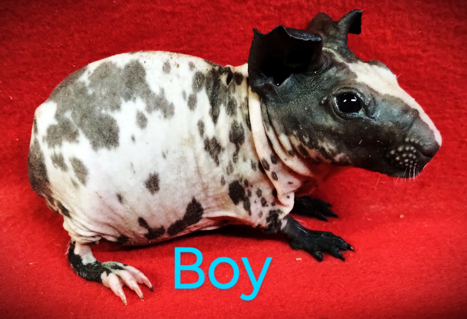 Baldwins are known for having skin of a rubbery texture, many wrinkles and large, droopy ears. They come in all colors and patterns that haired guinea pigs come in, such as Dutch, tortoiseshell, broken colors, Himalayan and self.