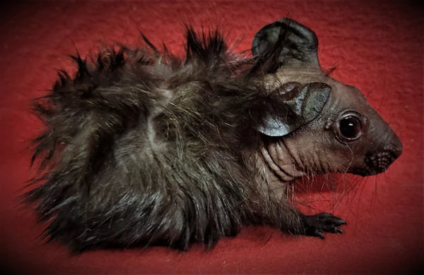 Baldwins are known for having skin of a rubbery texture, many wrinkles and large, droopy ears. They come in all colors and patterns that haired guinea pigs come in, such as Dutch, tortoiseshell, broken colors, Himalayan and self.