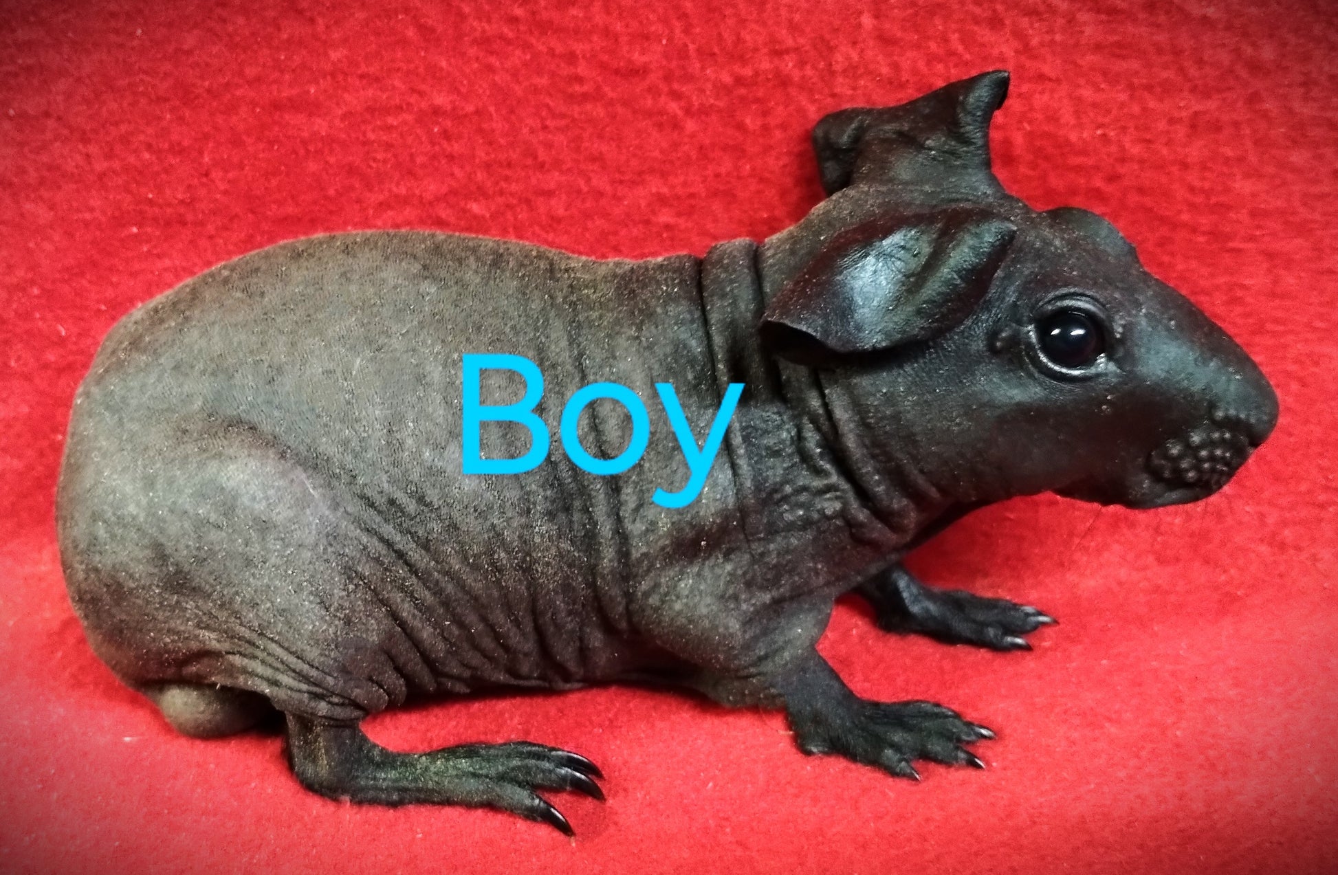 Baldwins are known for having skin of a rubbery texture, many wrinkles and large, droopy ears. They come in all colors and patterns that haired guinea pigs come in, such as Dutch, tortoiseshell, broken colors, Himalayan and self.