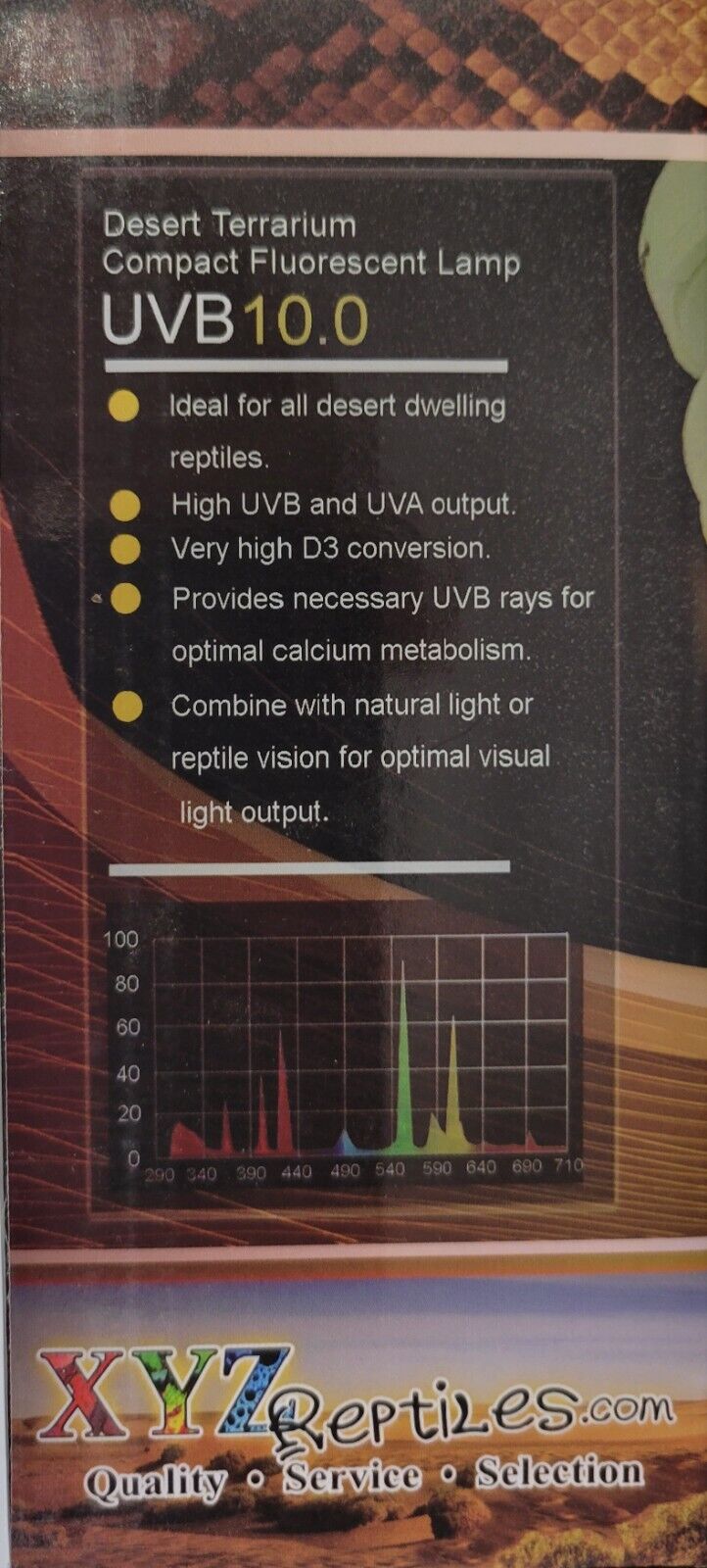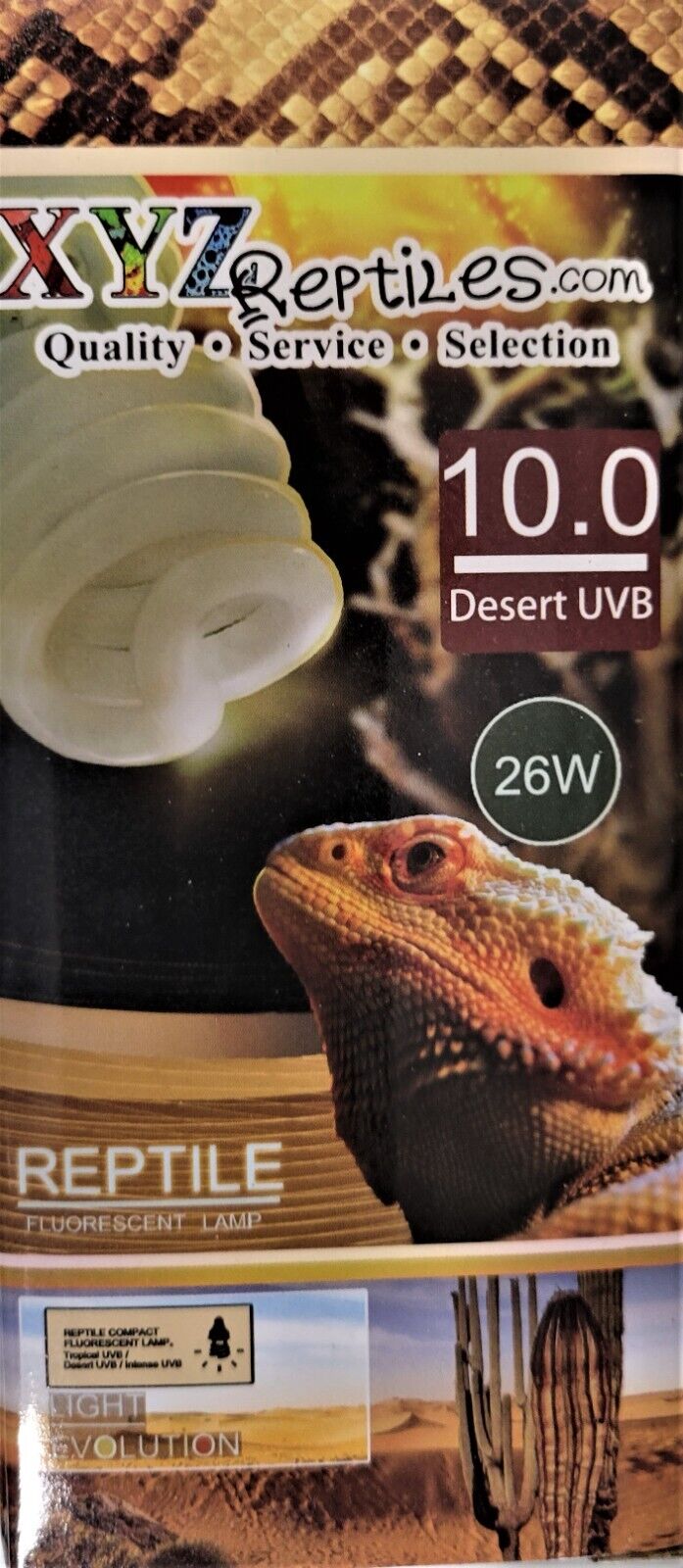 Our reptile UVB light bulb 10.0 is a fantastic source of high intensity UVB lighting for your pet lizards and tortoises. 10.0 UVB lights are perfect for bearded dragon lighting, chameleon lighting and tortoise lighting. The XYZReptiles UVB light bulb 10.0 is manufactured under strict and rigorous guidelines and ensures proper lighting for your pet.