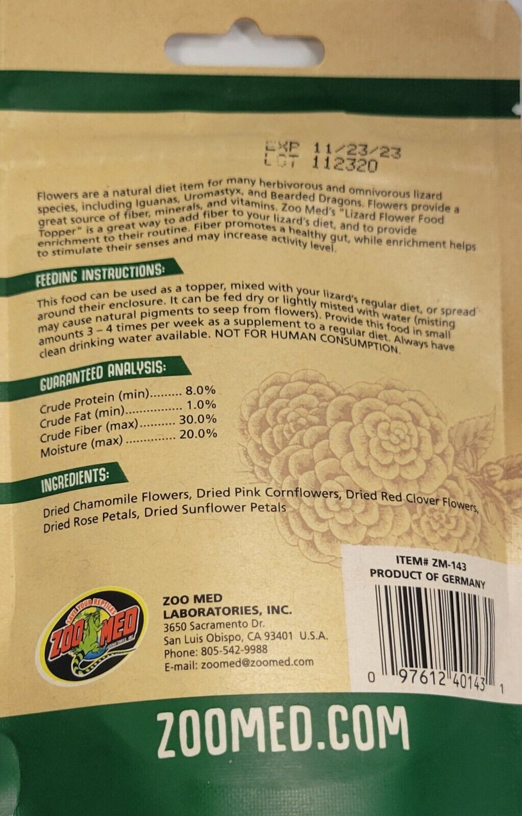 Feeding Guide: This food can be used as a topper, mixed with your lizards regular diet, or spread around the enclosure. It can be fed dry or lightly misted with water (misting may cause natural pigments to seep from flowers). Provide this food in small amounts 3-4 times per week as a supplement to a regular diet. Always have clean drinking water available. NOT FOR HUMAN CONSUMPTION.